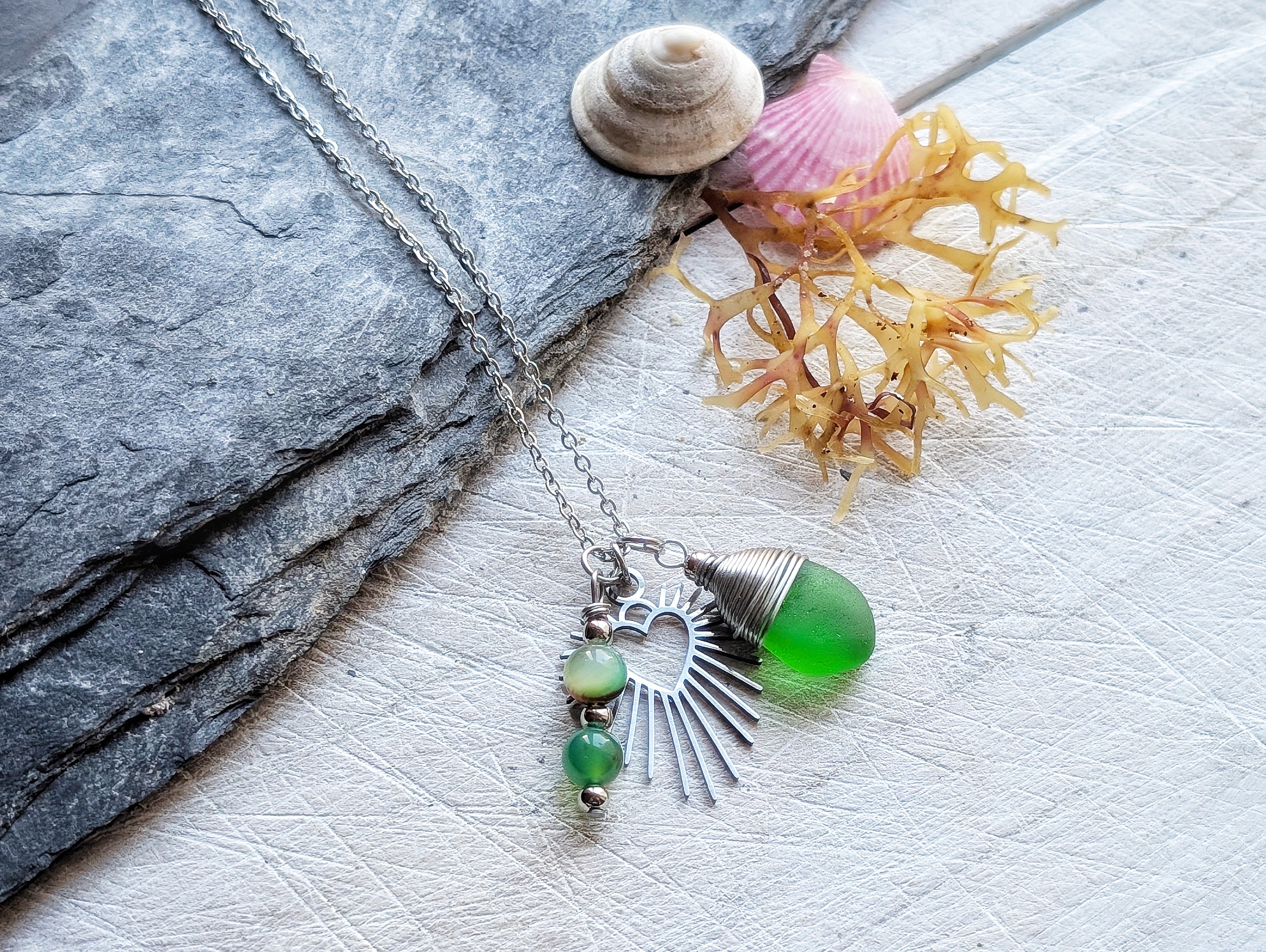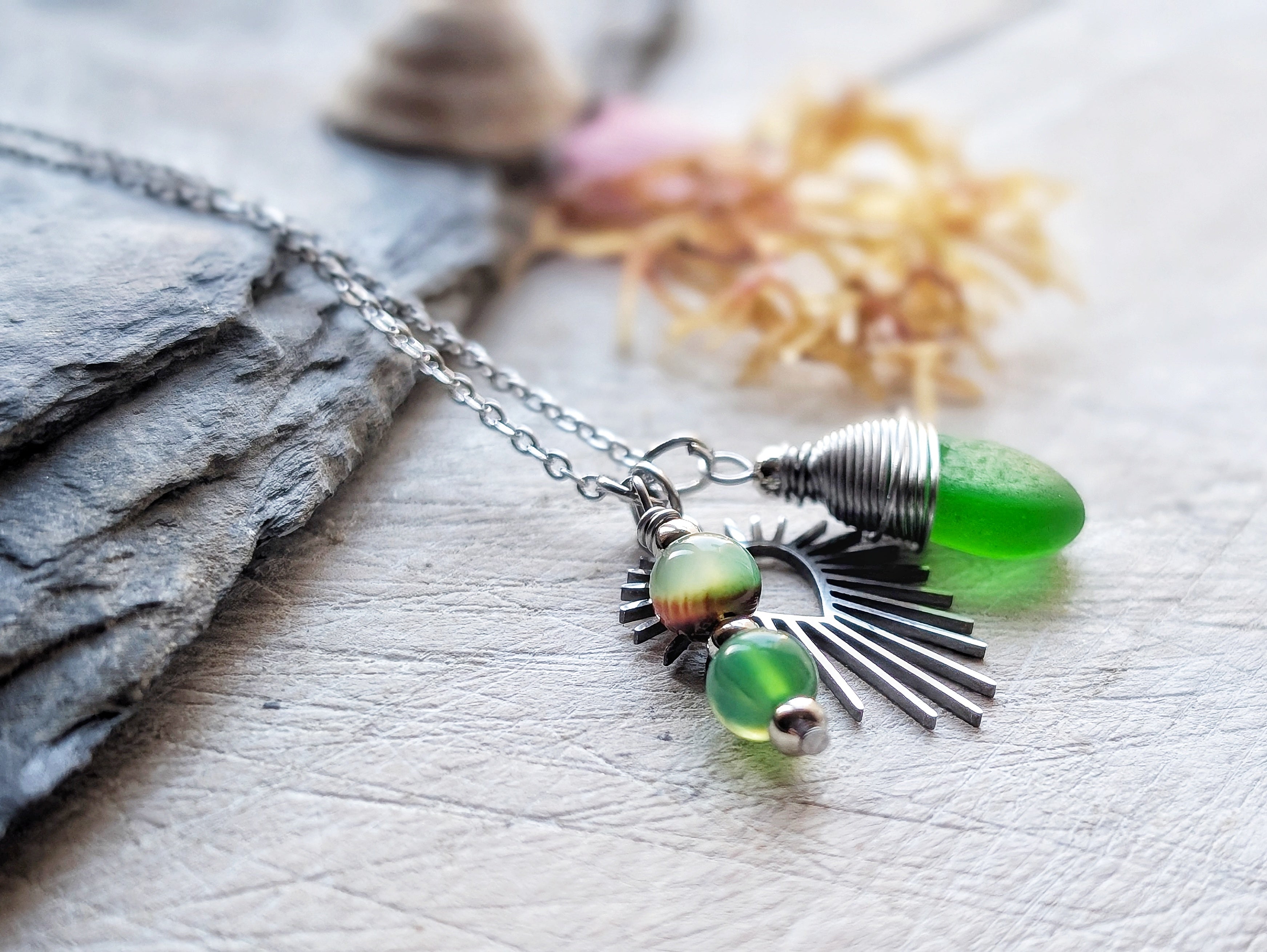 This Long Sea Glass Pendant features a beautifully frosted sea glass gem hanging from a 30" hypoallergenic stainless steel chain, with a gorgeous stainless steel charm and agate beads.
