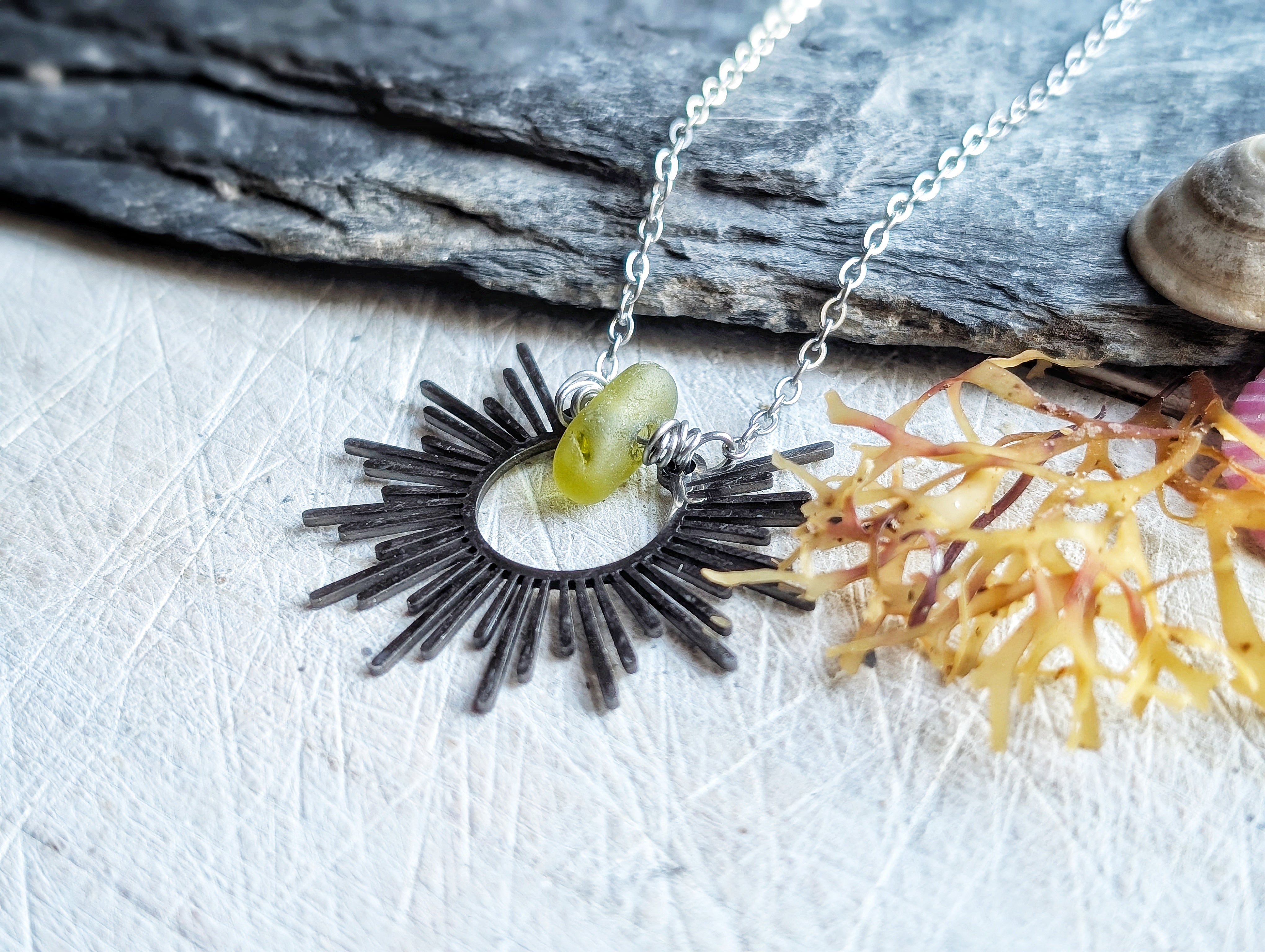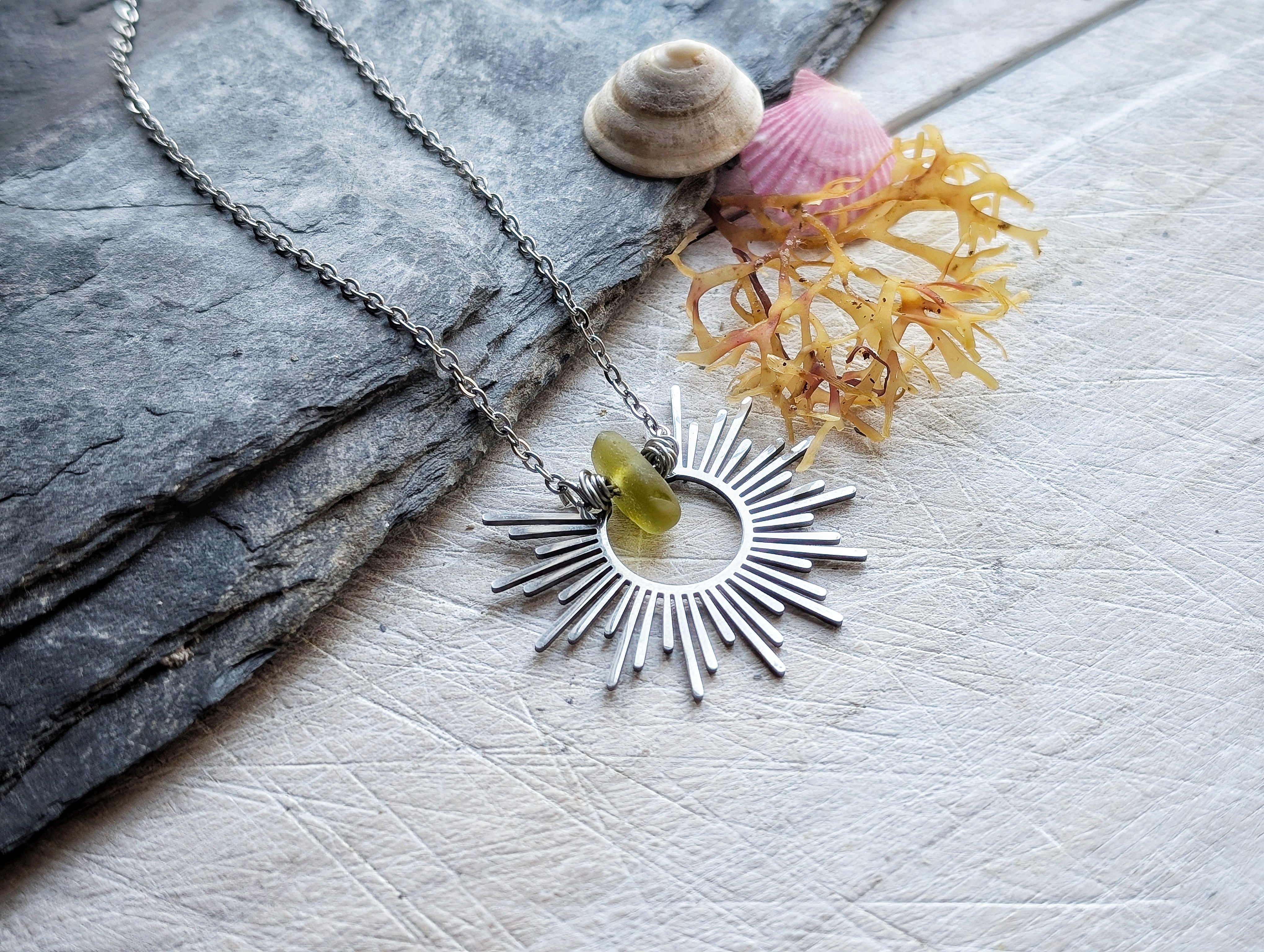 This Short Sea Glass Charm Necklace features a vibrant sea glass gem hanging from a 16" hypoallergenic stainless steel chain, with a gorgeous stainless steel burst charm.