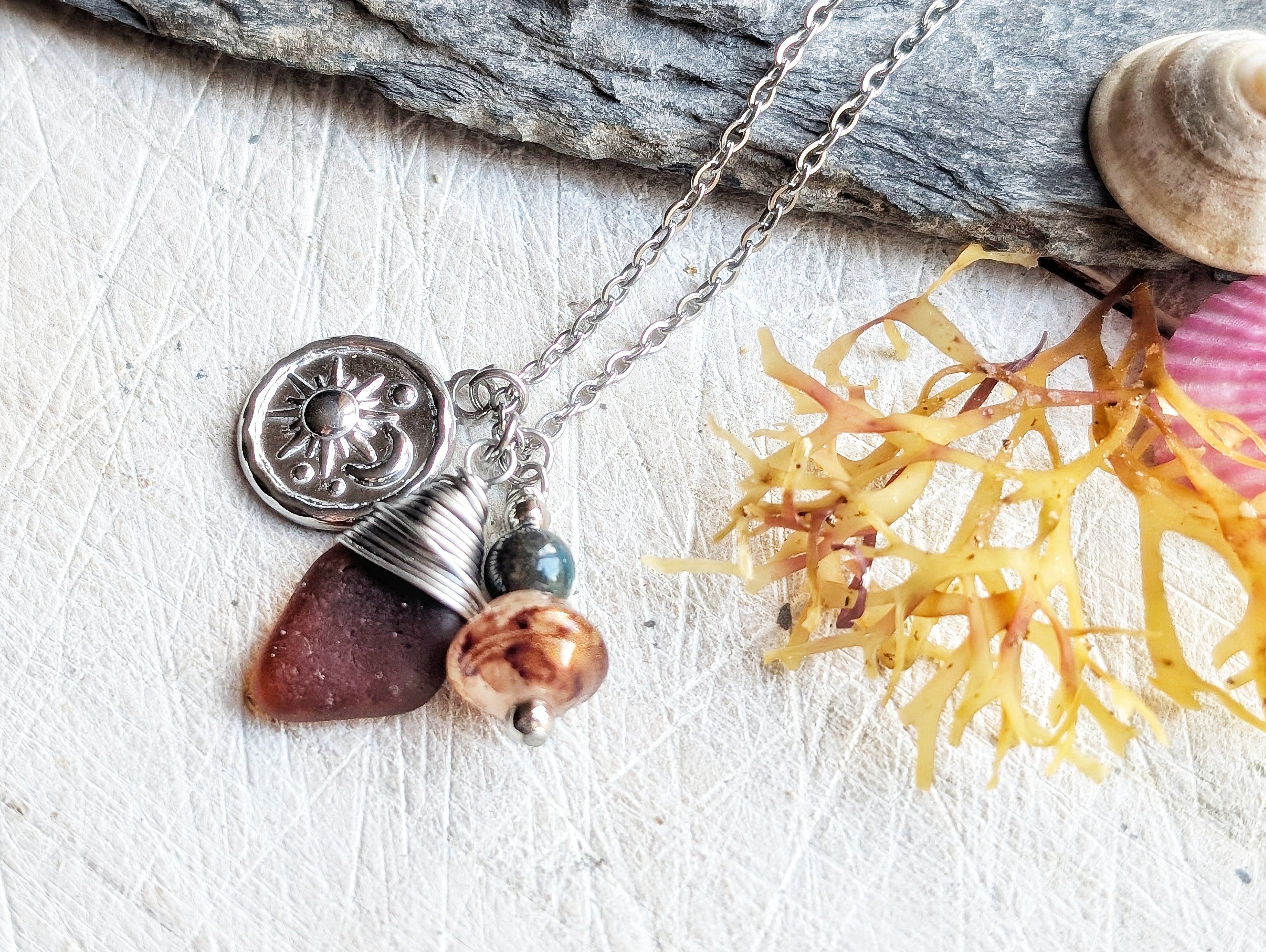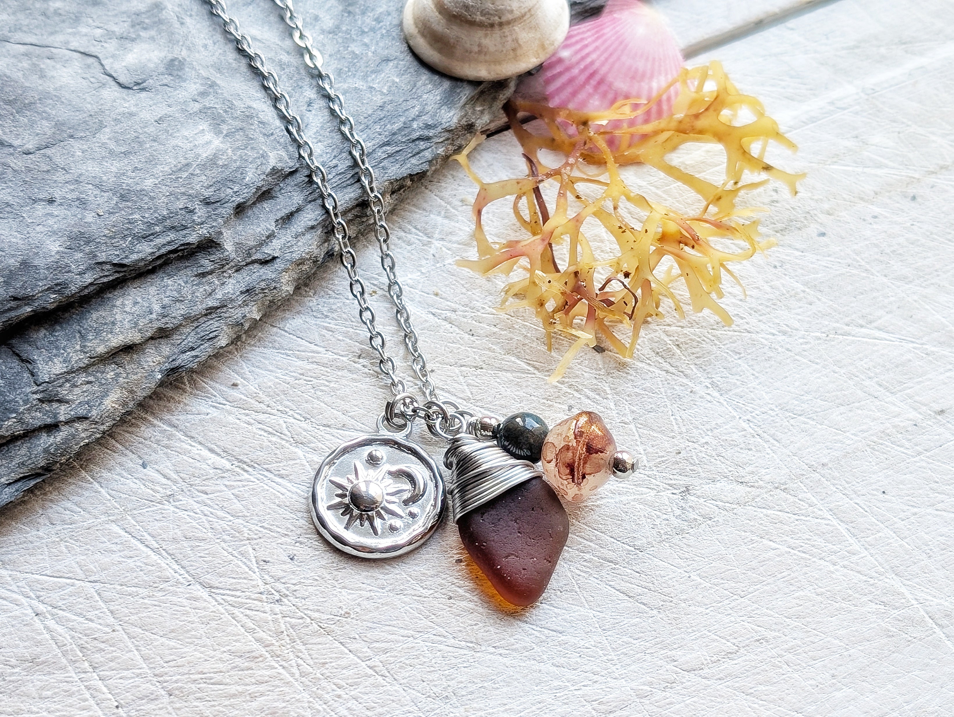 This Short Sea Glass Charm Necklace features a stunning sea glass gem hanging from a 16" hypoallergenic stainless steel chain, with a gorgeous stainless charm, agate bead and glass bead.