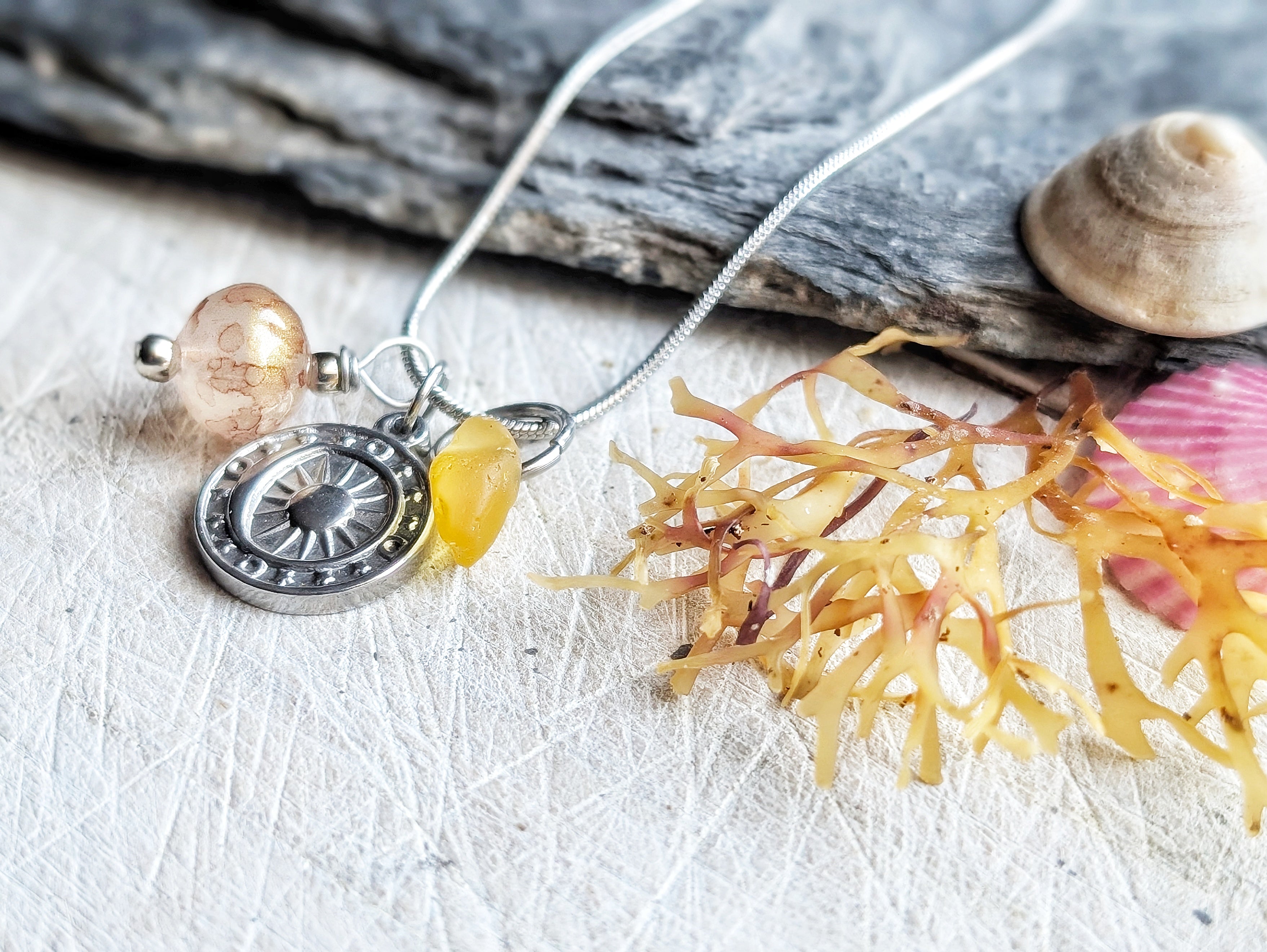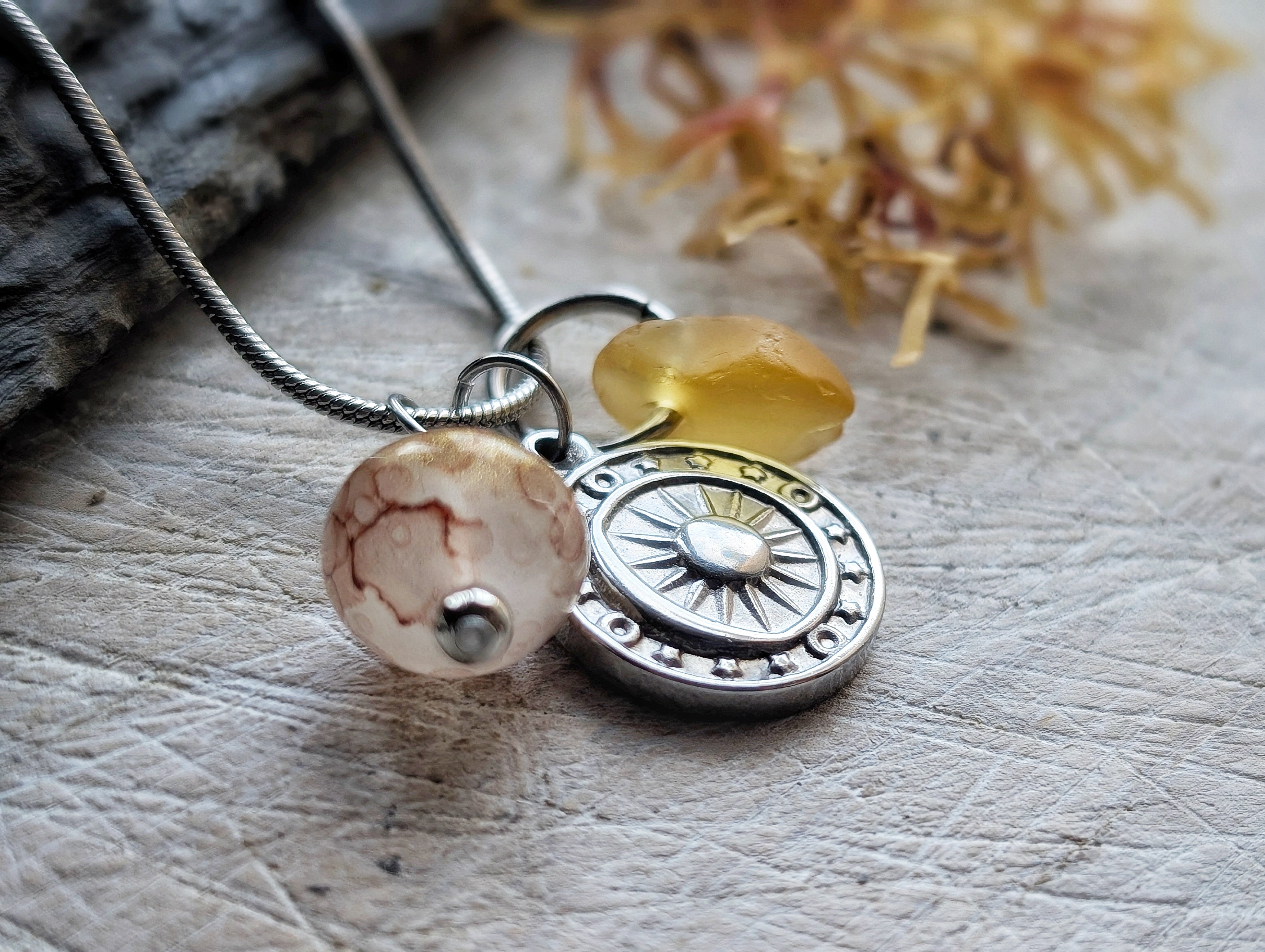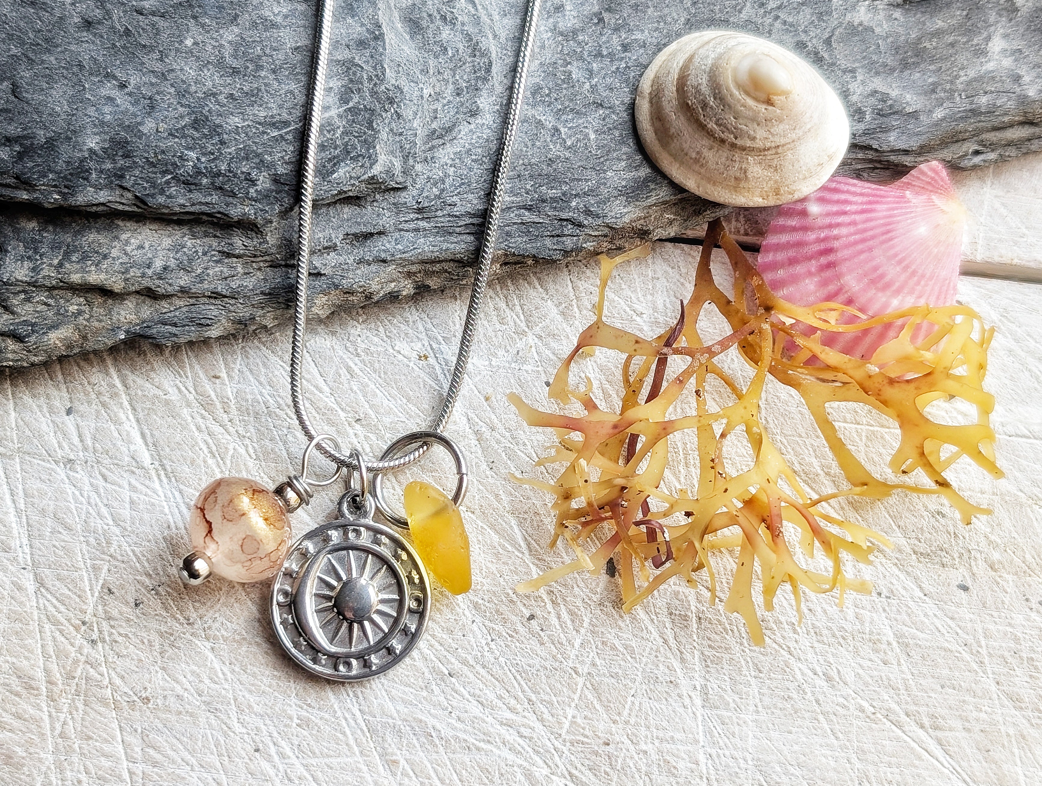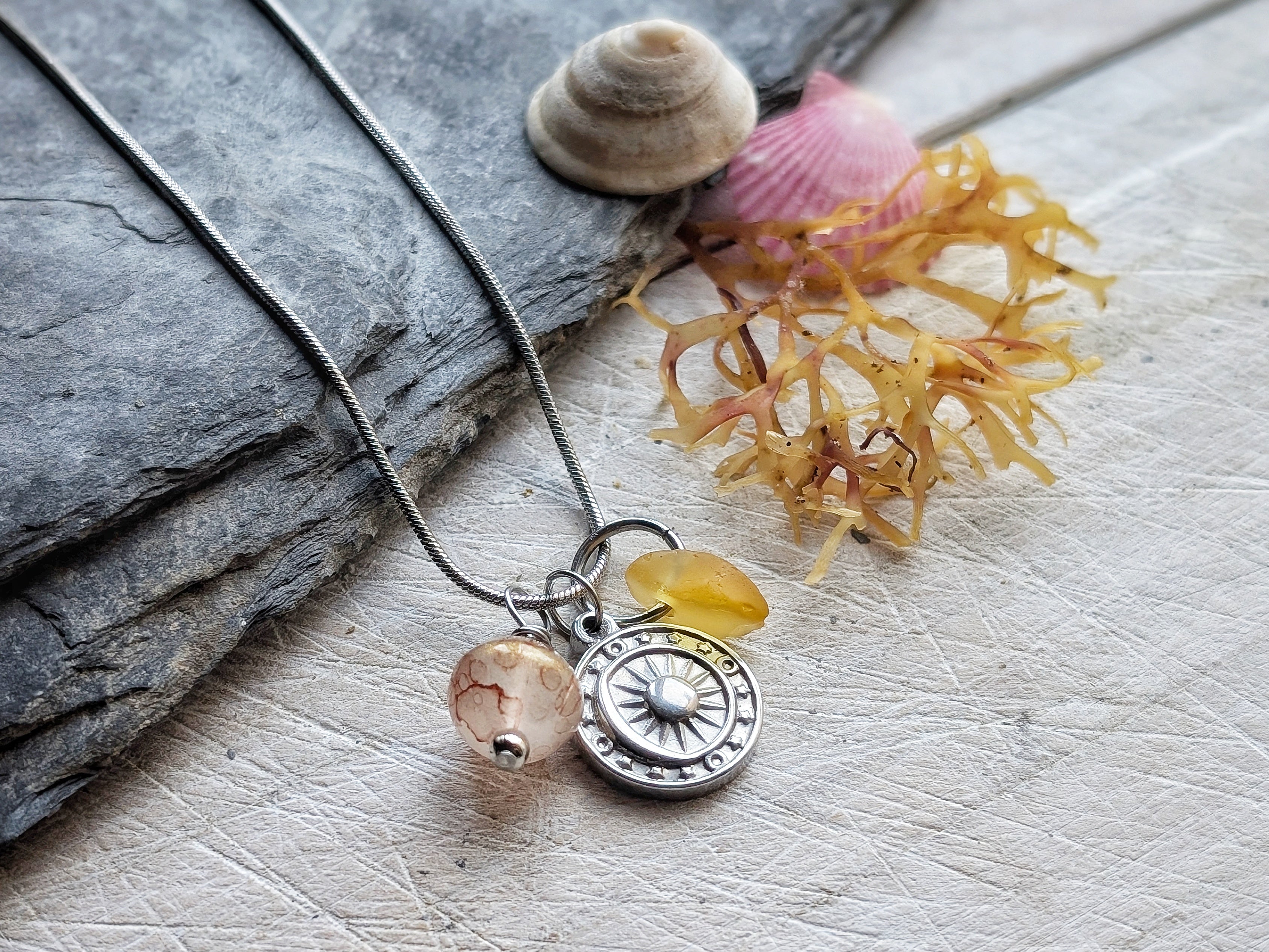 This Short Sea Glass Charm Necklace features a stunning rare yellow sea glass gem hanging from a 16" hypoallergenic stainless steel chain, with a gorgeous stainless steel charm and glass bead.